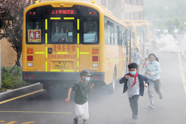 04:20分,隨著一聲哨響,煙霧彈點燃,整個校車停放處濃煙四起,剛剛測溫上了校車的學生,在校車司乘人員的組織下,快速從校車上跳下,沿著規定的撤離線路,有序撤離到學校操場的安全地帶,用時不到一分鐘,撤離速度達到了預期的效果。