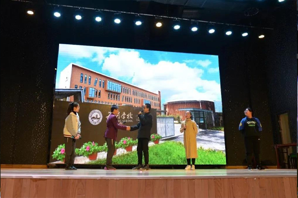 由高冰主任組織并參與,攜初中部張秋澤、趙璇、曾芳老師帶來的詩朗誦《致敬校長——我們收獲了》同樣感人至深。在英國作曲家愛德華·埃爾加《愛的禮贊》優美旋律伴襯下,四位老師以精品小學、優質初中、多元高中、高端國際教育、傳統文化五個點,勾勒雷校長青島辦學六年來,對教育發展所做的貢獻。“還是那學校還是那海灣,還是那創業者伴著那山。今日的為明已成為標桿,功德的高境界只要平凡。”朗誦節目深沉收尾,徐雨軒、任雪兩位老師隨后登臺哼唱歌曲《只要平凡》;LED屏上,逐幀播放著雷校長六年來的經典瞬間,移人情思。
